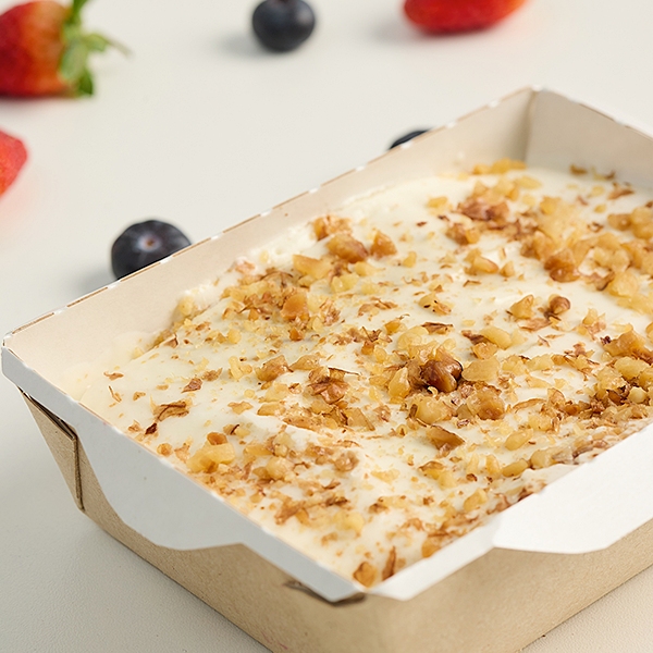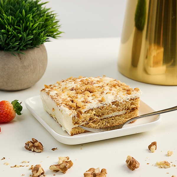 "Царский" – это изысканный десерт, созданный исключительно из натуральных ингредиентов по уникальному рецепту. В его основе – ароматное, рассыпчатое медово-песочное тесто, пропитанное лёгким и нежным сметанным кремом. Крем на основе натуральной сметаны с разной жирностью придаёт десерту особую бархатистость и мягкость. Завершающий штрих – украшение из грецких орехов, добавляющее пикантную ореховую нотку и лёгкий хруст.