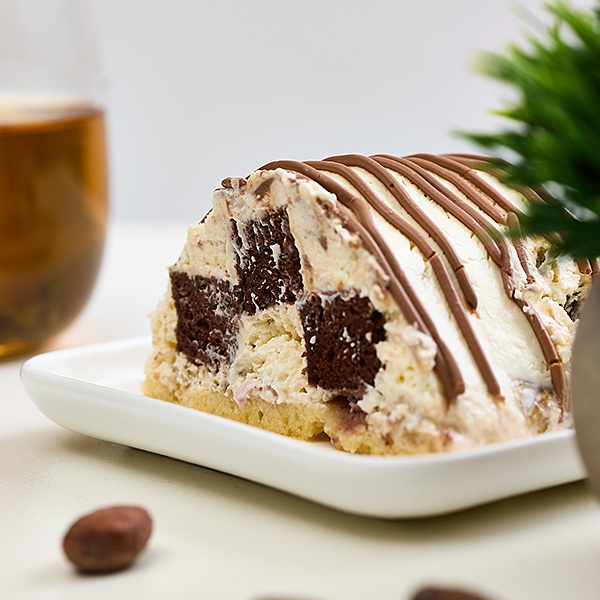 В составе — кусочки консервированных ананасов и персиков, грецкий орех, какао и ваниль, что придаёт десерту сбалансированный вкус и лёгкие фруктовые нотки. Верх торта покрыт шоколадной глазурью.