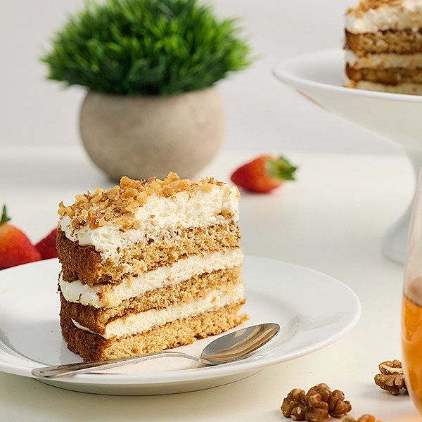 Нежный медово-сметанный торт с грецкими орехами, приготовленный по оригинальному рецепту из натуральных ингредиентов. В составе — четыре ароматных медово-песочных коржа, пропитанных лёгким сметанным кремом.